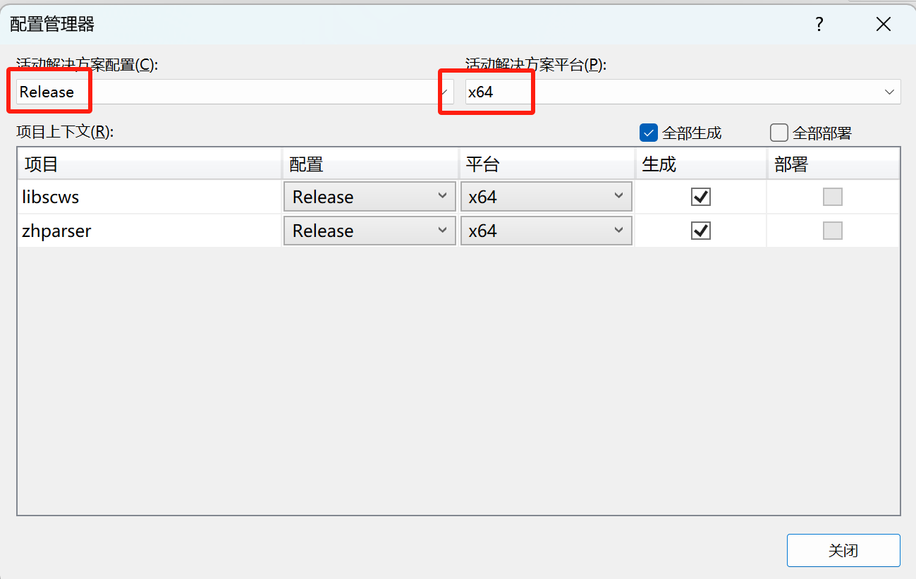 - 若你使用 64 位系统,可继续在该属性页面操作:点击窗口右上角的配置管理器,新建活动解决方案平台,选择新平台为x64,点击确定即可。