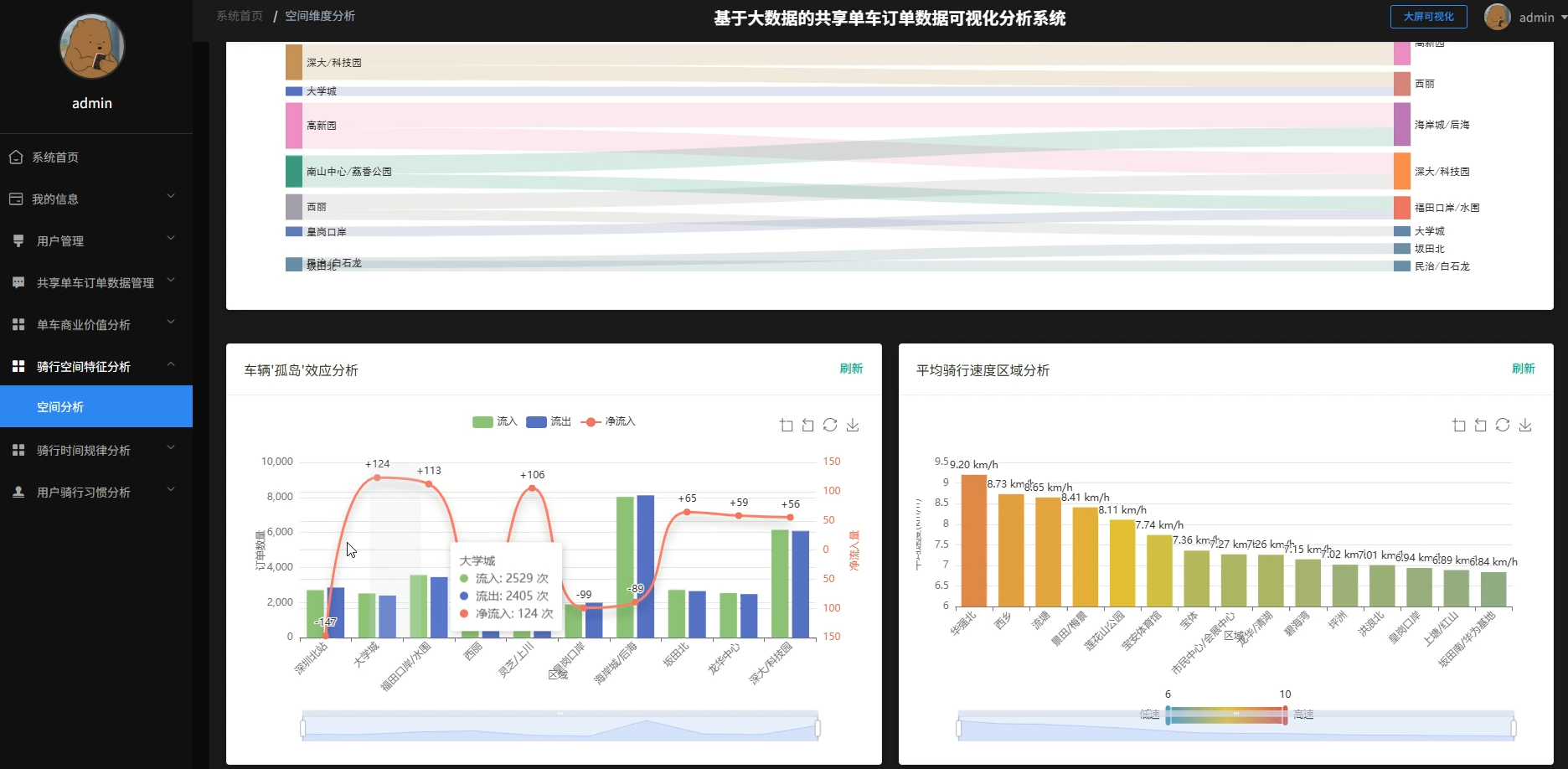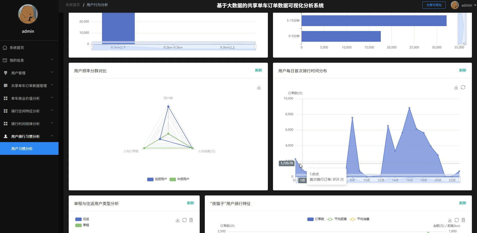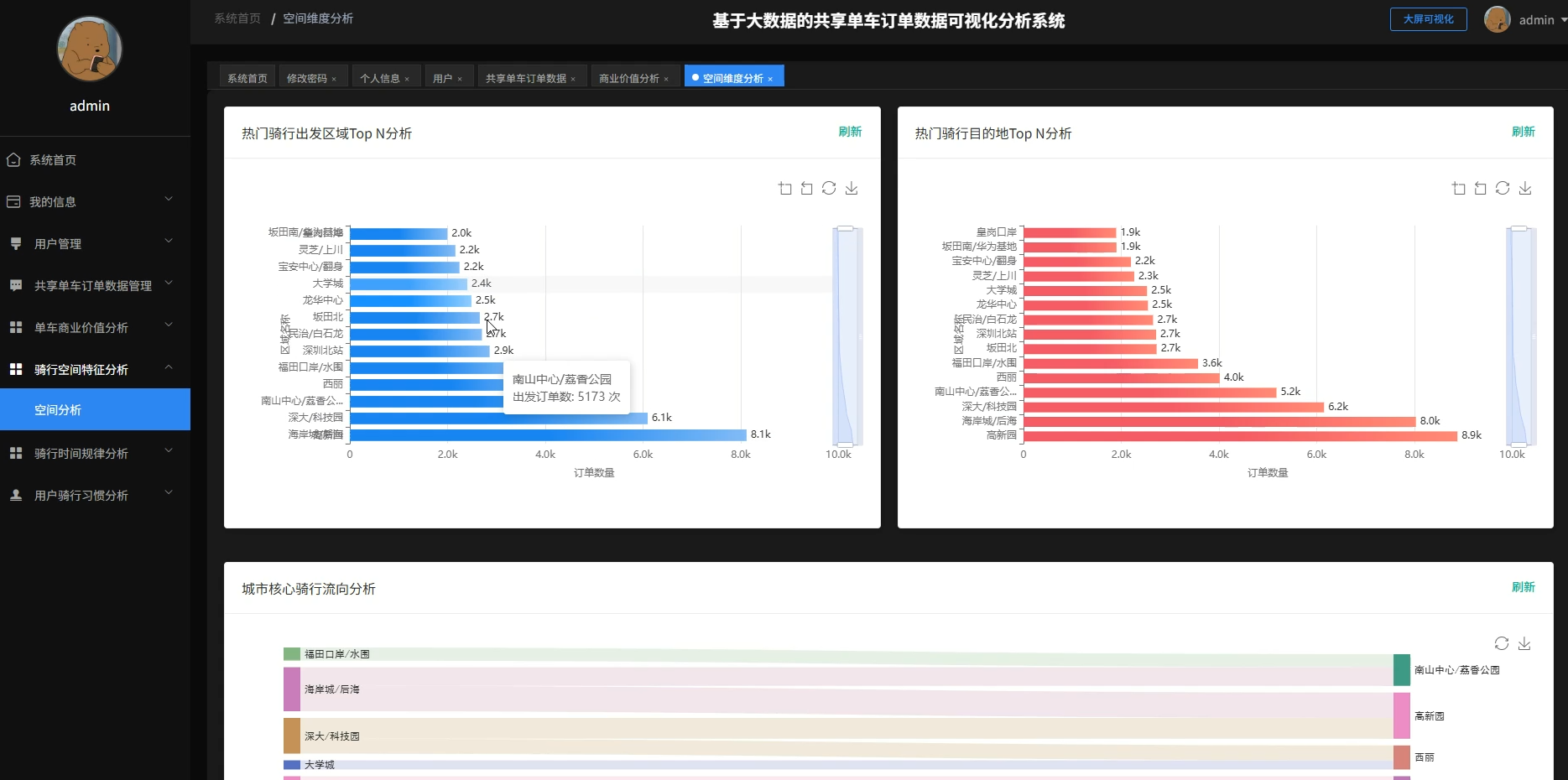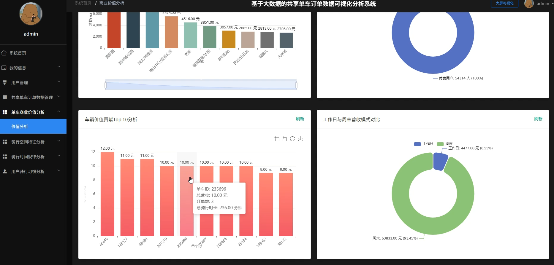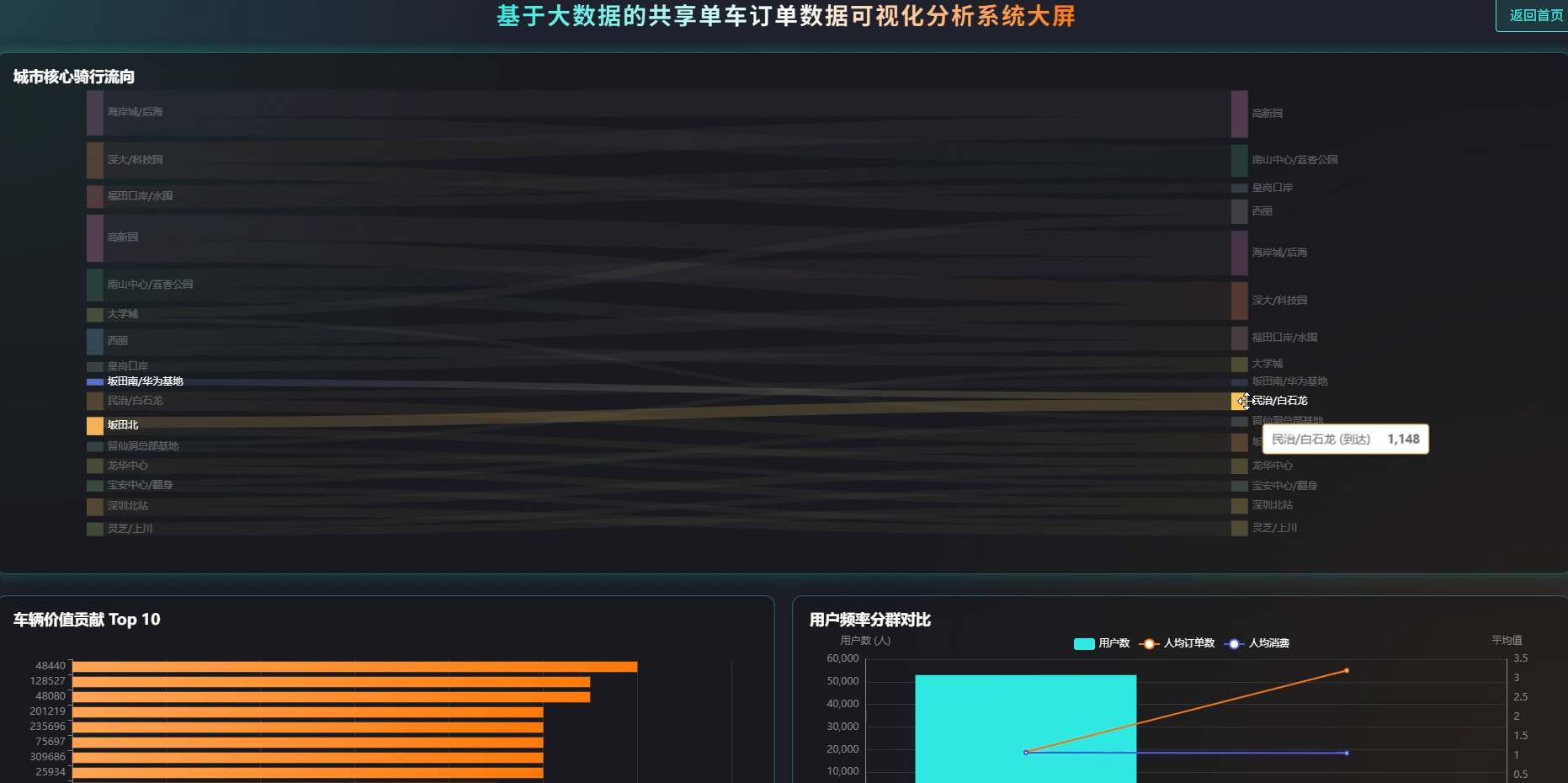 本系统是一套专门针对共享单车订单数据进行深度挖掘与可视化展示的大数据分析平台,技术架构以Python生态为主,采用Django作为Web开发框架,后端数据处理引擎选用Apache Spark进行海量订单数据的分布式计算与清洗,前端可视化组件借助ECharts实现多维数据图表的动态渲染。整个系统围绕时间、空间、用户行为、业务价值四大分析维度展开设计,能够处理包含订单ID、用户ID、车辆ID、起止时间、骑行时长、地理编码、费用金额等核心字段的原始数据集。在时间维度上,系统实现了全天各时段订单量统计、工作日与周末模式对比、周内活跃度波动、月度趋势变化以及分时段骑行时长分析;在空间维度上,开发了热门出发地与目的地识别、城市核心流向热力图、车辆孤岛效应检测、区域平均速度计算等功能;用户行为维度涵盖骑行距离与时长分布、用户频次分群、首次骑行时间、往返类型判断、夜猫子特征提取、月度留存率统计;业务价值维度则包括费用与时长关系、时段营收贡献、区域营收能力、付费行为对比、单车价值贡献、工作日周末营收差异等分析模块。所有分析结果均以交互式图表形式呈现,支持数据筛选、下钻、联动等操作,为用户提供直观的数据洞察能力。
