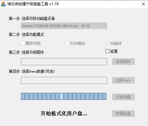 将Micro SD卡通过读卡器插至PC机USB接口,打开瑞芯微创建升级磁盘工具,在"第一步:选择可移动设备"中选择可移动磁盘设备,然后点击"恢复磁盘"进行格式化,如下图所示。
