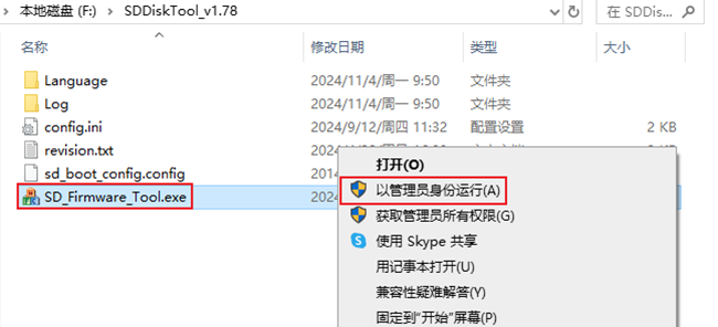 右键SD_Firmware_Tool.exe,然后点击"以管理员身份运行(A)"打开工具。