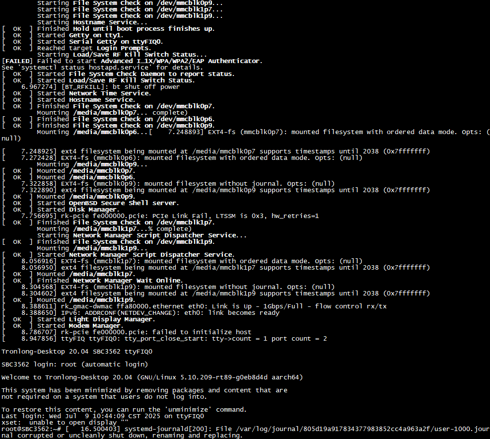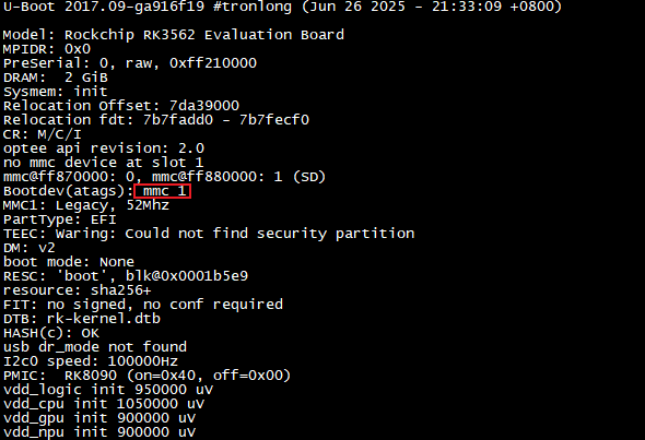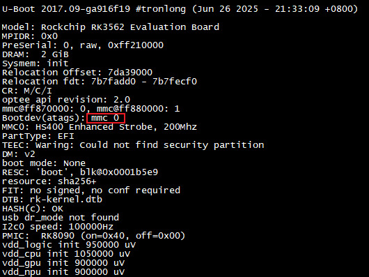 单板机无需断电,取出SD升级卡,单板机将自动从eMMC启动系统。系统启动后自动登录root用户,调试串口终端会打印如下类似启动信息,"Bootdev(atags):mmc 0"表示从eMMC启动。