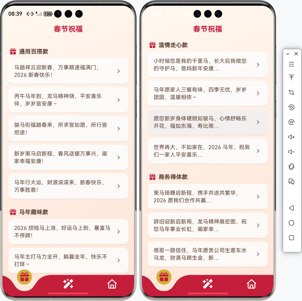 春节祝福列表页(分类 + 卡片列表,点击进详情) |