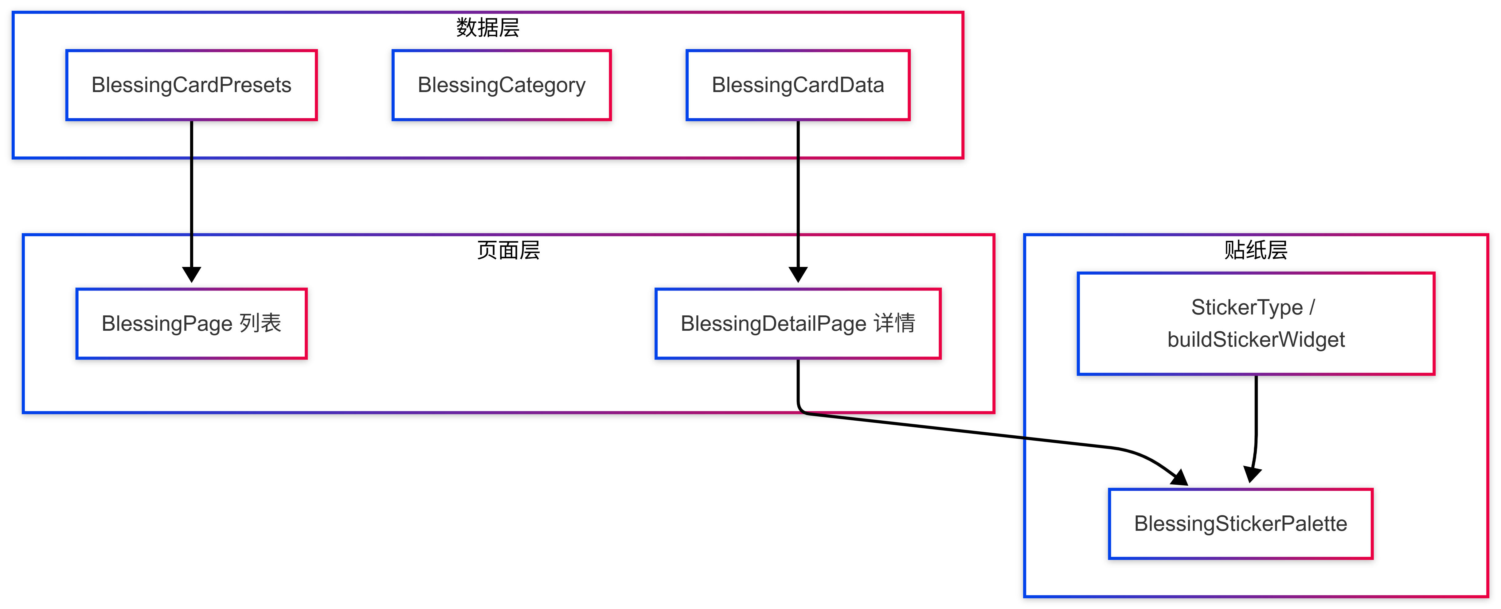 Widget、贴纸选择栏(BlessingStickerPalette)集中在blessing_page_stickers.dart,详情页只负责「添加/拖动/截图」,贴纸样式扩展在一处完成。 - 列表与详情拆分:列表页只做分类展示与跳转,详情页只做单卡编辑与分享,职责清晰,便于维护与多端一致。
