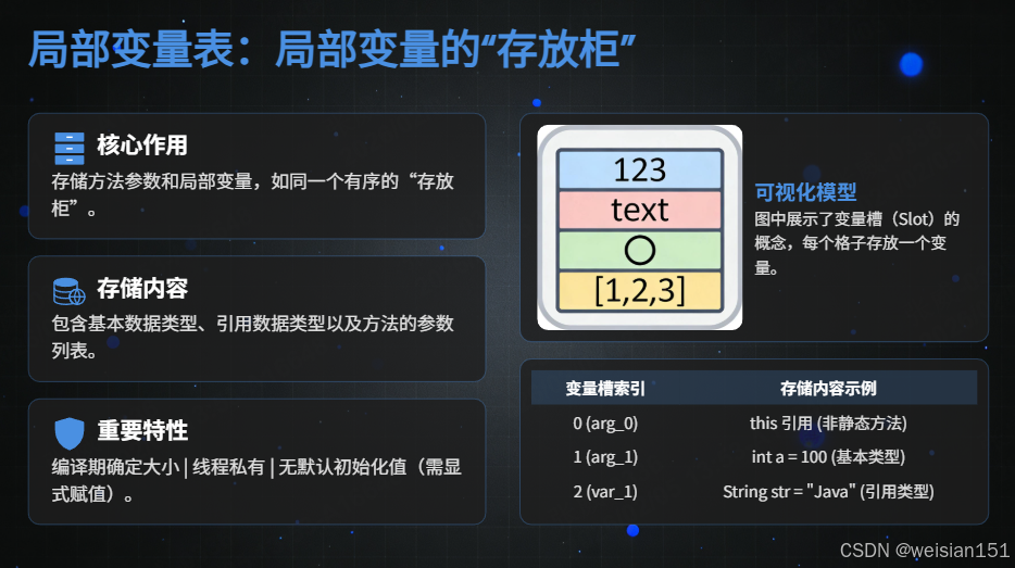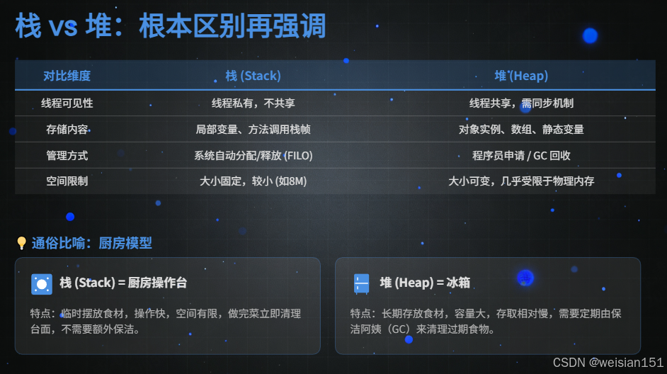 - 栈 = 厨房的操作台,每次做菜(方法调用)都会临时摆放食材(局部变量),做完即清;