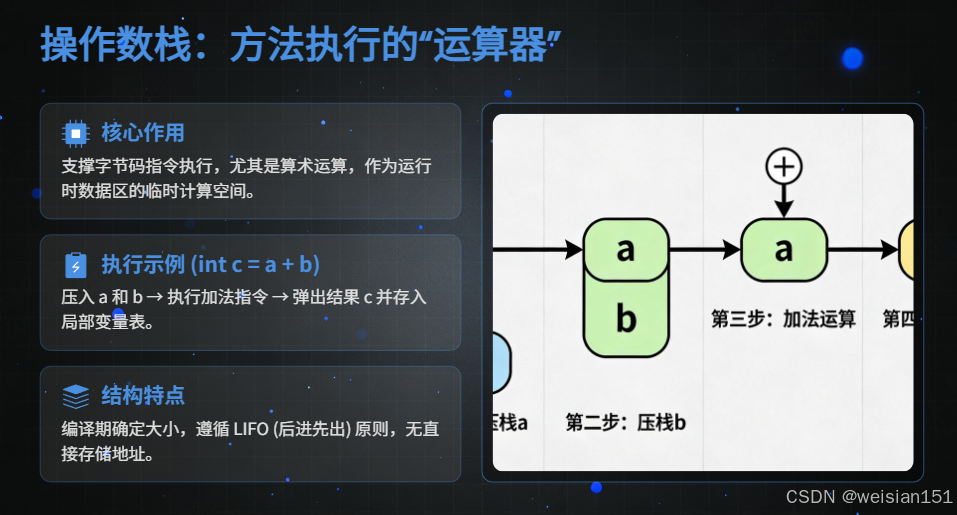 | 虚拟机栈 | 支撑 Java 方法 的执行 | 执行 Java 字节码指令(.class 文件中的指令) |