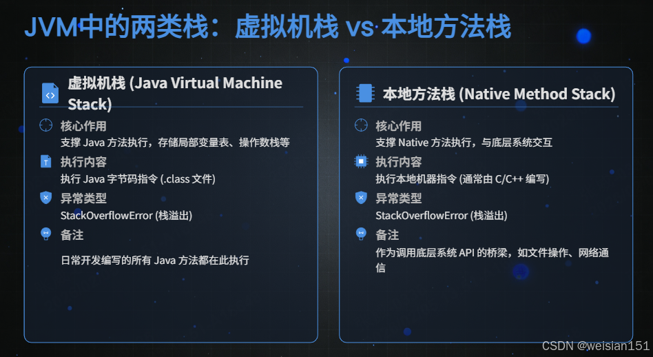 | 本地方法栈 | 支撑 本地方法(Native 方法) 的执行 | 执行本地机器指令(C/C++ 编写的代码,无字节码) | StackOverflowError、OutOfMemoryError(极少出现) |