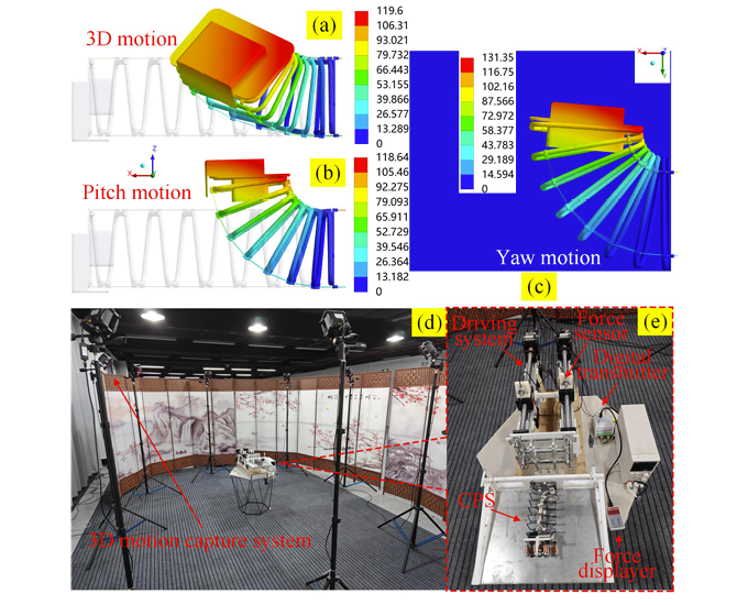图5:(上)CPS的仿真变形。(a)三维运动;(b)俯仰运动;(c)偏航运动。(下)实验装置。(d)CPS的整体实验平台;(e)平台的局部详细结构。
