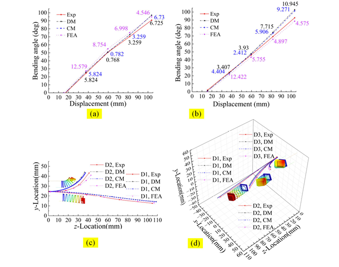 图6:不同缆线位移下的弯曲角度。(a) 偏航运动;(b) 俯仰运动。不同缆线位移下的脊柱形状。(c) 俯仰运动;(d) 三维运动。两种动力静态方法分为离散方法(DM)和连续方法(CM)。