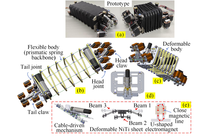 A1:主要优势是灵活性和适应性。可伸缩棱柱弹簧主干允许机器人在狭窄、非圆截面、曲面和不连续表面稳定爬行,同时结合旋转关节和主动变形爪,实现多用途运动,而传统机器人通常受限于刚性结构或圆截面设计。