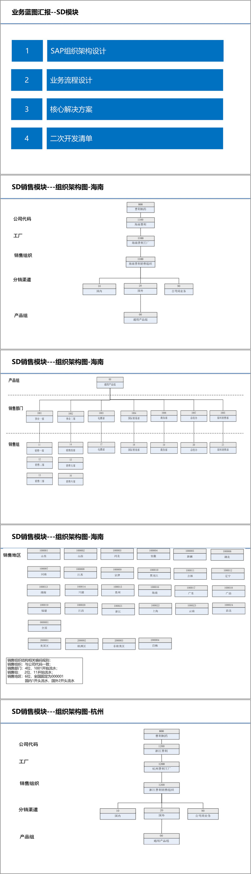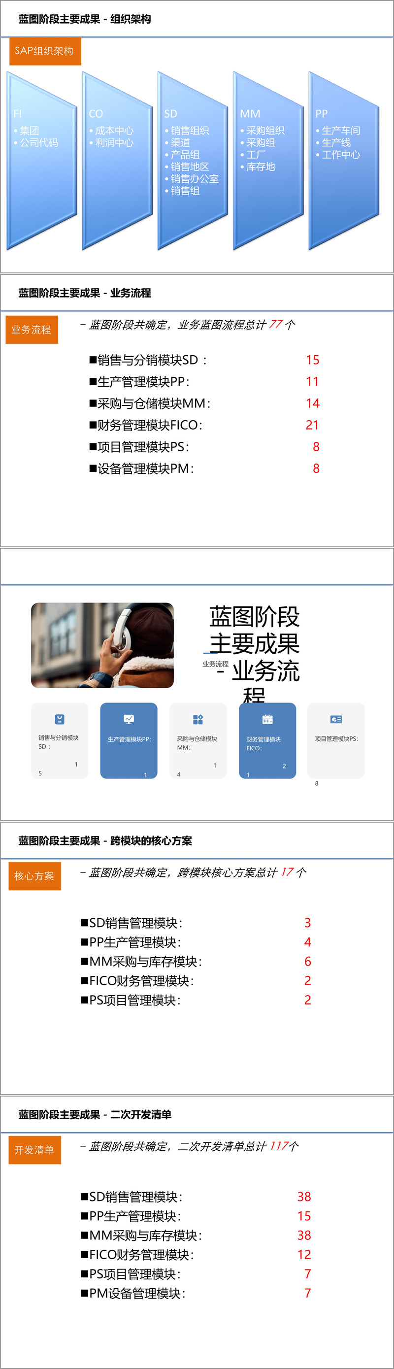业务蓝图是方案核心,涵盖销售(SD)、财务(FICO)、生产(PP)、采购与仓储(MM)、设备(PM)、项目(PS)六大模块。销售模块构建了海南、杭州等区域的组织架构,明确 15 个核心业务流程,涵盖客户主数据维护、销售订单管理、发货出库等全流程,通过回款认领、客户授信管理等核心方案,实现销售业务规范化;同时规划 38 项二次开发与多项接口开发,保障与 GSP、WMS 等系统的数据同步。