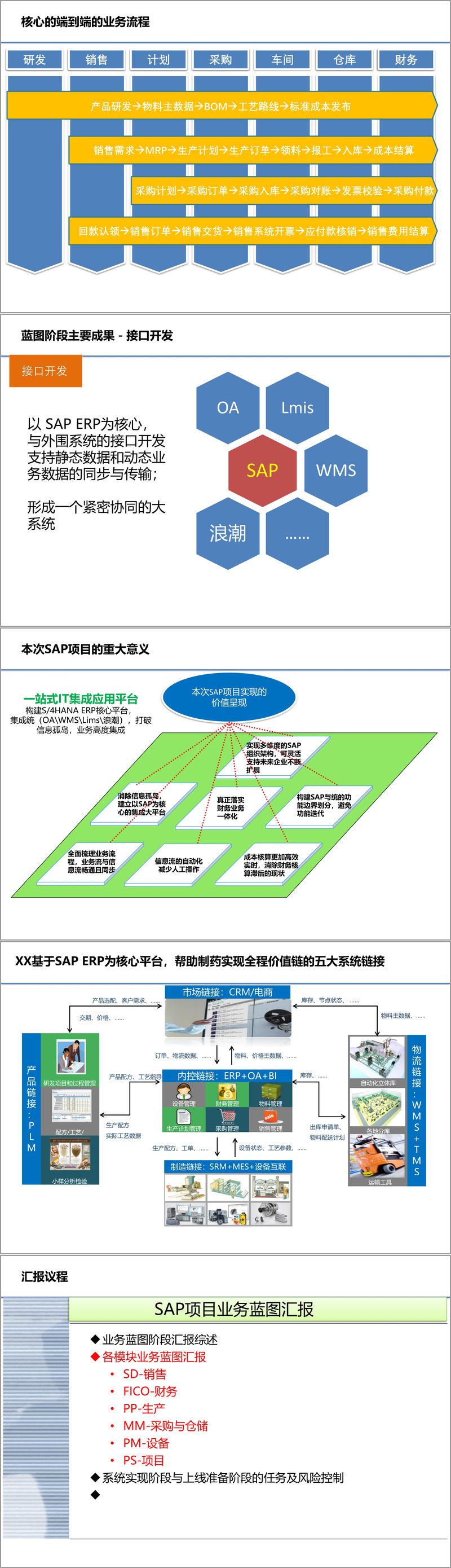 本次 SAP 项目的核心价值在于构建一站式 IT 集成应用平台,实现财务业务一体化、信息流自动化,消除信息孤岛,同时通过多维度组织架构设计,支持企业未来扩展。各模块的协同联动与系统集成,将全面提升制药集团的运营效率与管理水平。