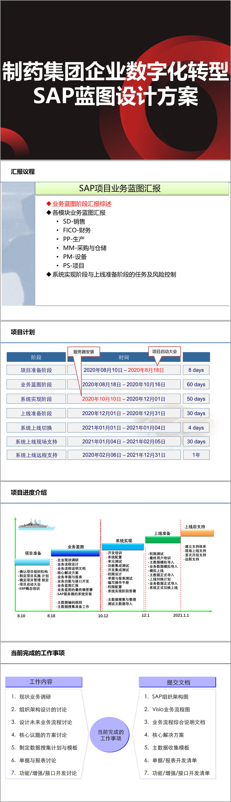 本方案是某大型制药集团数字化转型的核心蓝图,以 SAP 系统为核心,构建覆盖全业务链条的一体化管理平台,旨在打破信息孤岛、优化业务流程、提升运营效率。方案整体分为项目规划、各模块业务蓝图、系统实现与上线准备三大核心部分,形成了从调研设计到落地执行的完整闭环。