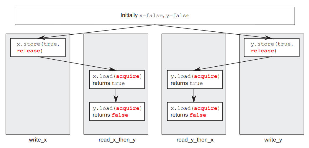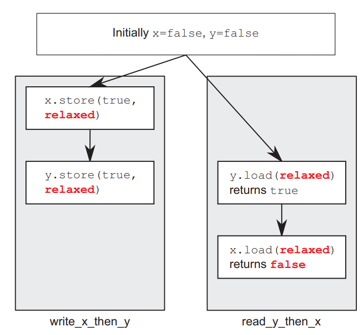 while (!y.load(relaxed)); // ④ 不断查电报(可能收到乱序的 earlier 消息)