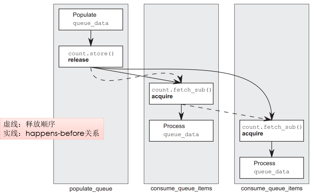 图片中:从 store 画出的实线箭头指向两个消费者的 fetch_sub,表示"happens-before"关系