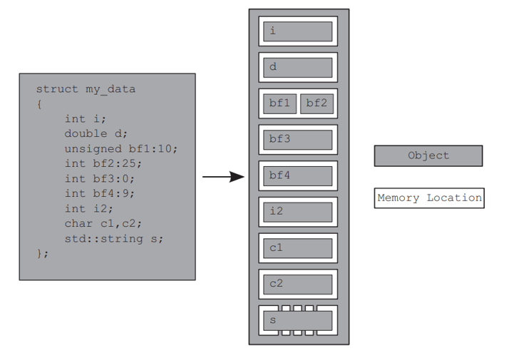 下例中,bf3 通常没有自己的内存位置,而 bf4 会有自己的内存位置。bf是bitfield的缩写,即位域,后面的数字表示在内存中占多少位。用竖直方框表示内存地址从低到高的排列
