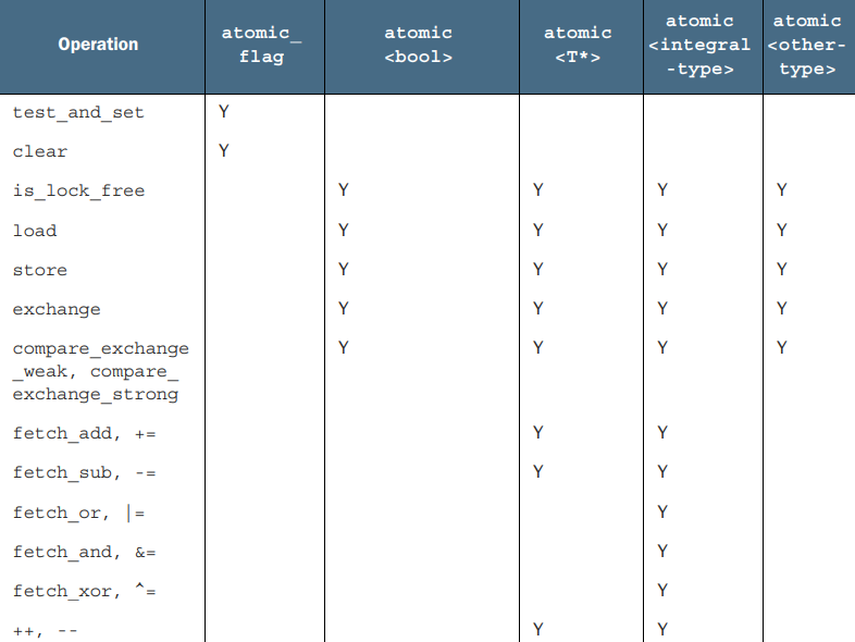 std::atomic_flag是唯一没有提供is_lock_free()成员函数的原子类型。它是一个简单的布尔标志,其操作必须为无锁,这是实现其他原子类型的基础。除了std::atomic_flag外,其余的原子类型都是通过std::atomic类模板的特化来访问的,它们功能更全面,但可能不是无锁的。在大多数流行平台上,预期所有内置类型的原子变体(如std::atomic<int>)都是无锁的,但这并不是必须的。