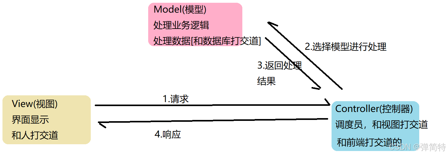 我们传统的mvc呢就是我们需要自己去写视图,就是说我们视图把根据请求发送给我们的控制器,然后控制器呢去调度处理,选择我们的模型进行一个数据的处理,处理完毕之后呢把结果返回给我们的控制器,然后我们控制器最终呢将响应返回给我们的视图。