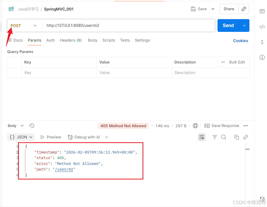 但是我们的POST请求会报错:会报一个405的错误,我们前面说过,4开头的是客户端出问题了,404是不允许访问,而405则是方法不被允许。