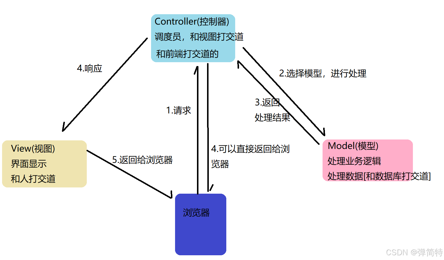 而我们的spring mvc呢,它核心呢就是关注于spring web,也就是说呀,能把我们传统的mvc变得更加的灵活。比如我们会有一种情况,如图所示,我们浏览器呢直接可以去请求控制器,然后控制器去调用我们的模型,然后模型把数据给返回给我们的控制器,最终控制器直接就可以把数据呢响应给我们的浏览器。