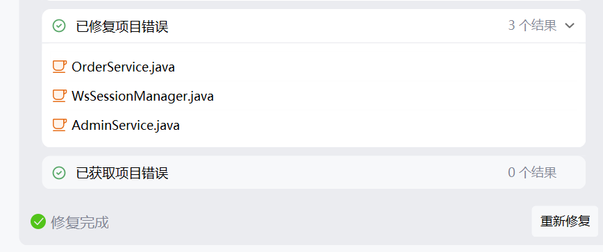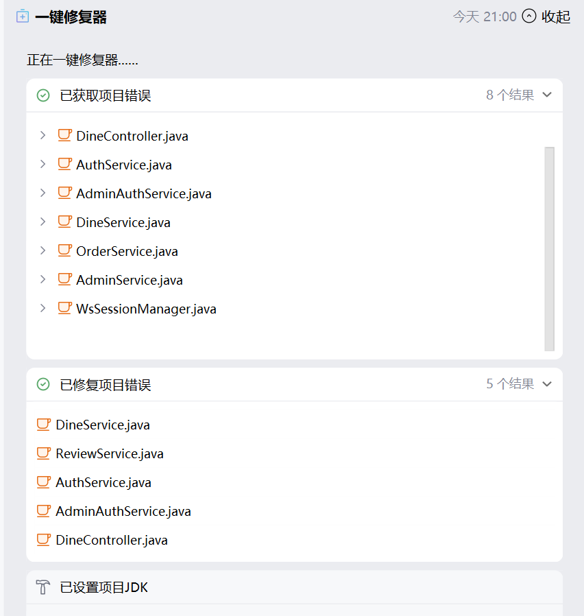 ● 在修复过程中,控制台实时显示进展:哪些文件存在问题,哪些已被修复,以及项目JDK配置是否正确设置。