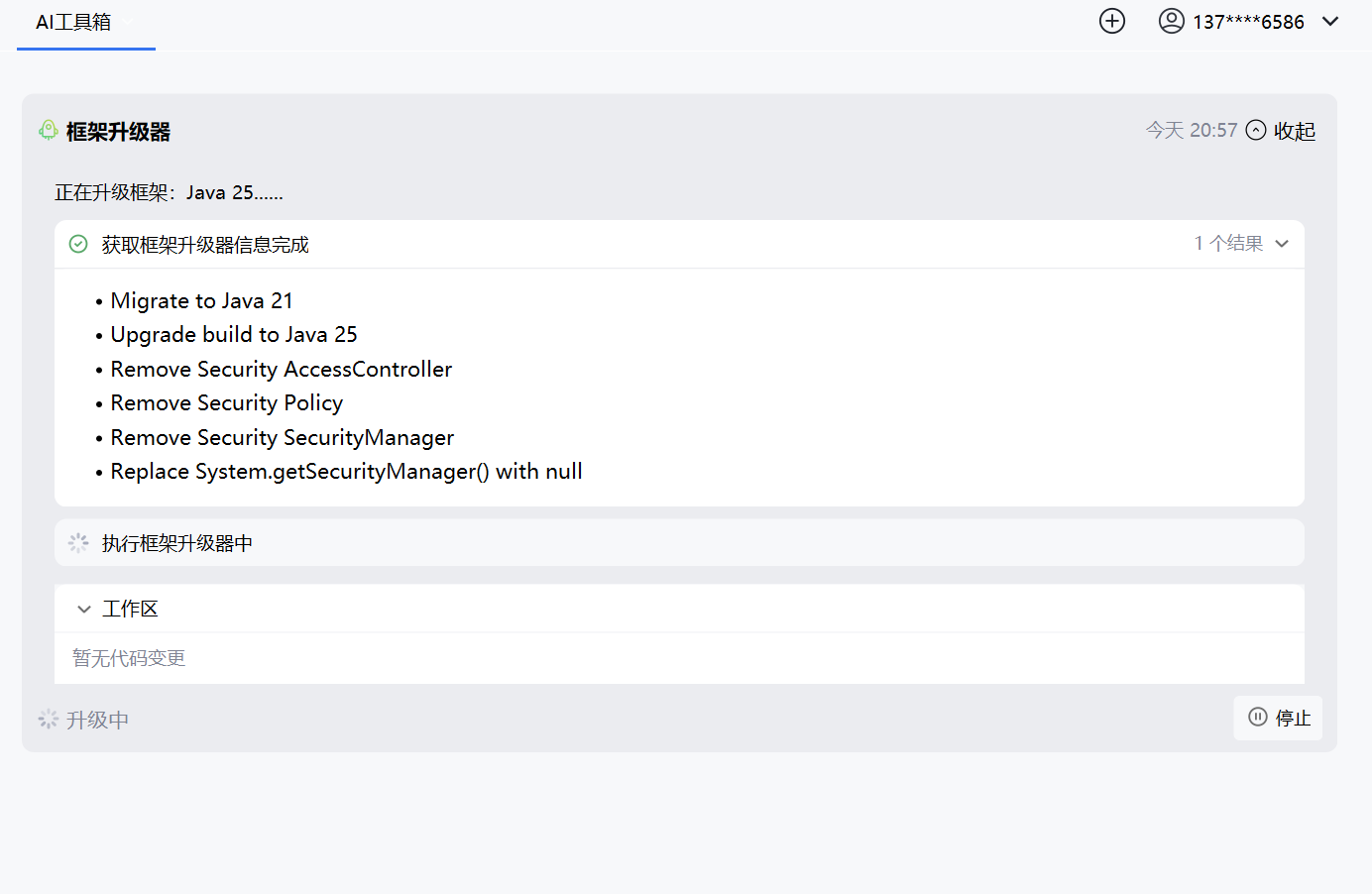 整个过程在30秒内完成。对比之下,如果手动操作,我需要:查阅JDK 25的发布说明和废弃API列表;在项目中全局搜索这些API的使用点;寻找合适的替代方案并逐一修改;最后进行充分的测试验证。工具不仅节省了时间,更关键的是避免了人工操作可能导致的遗漏或误改。