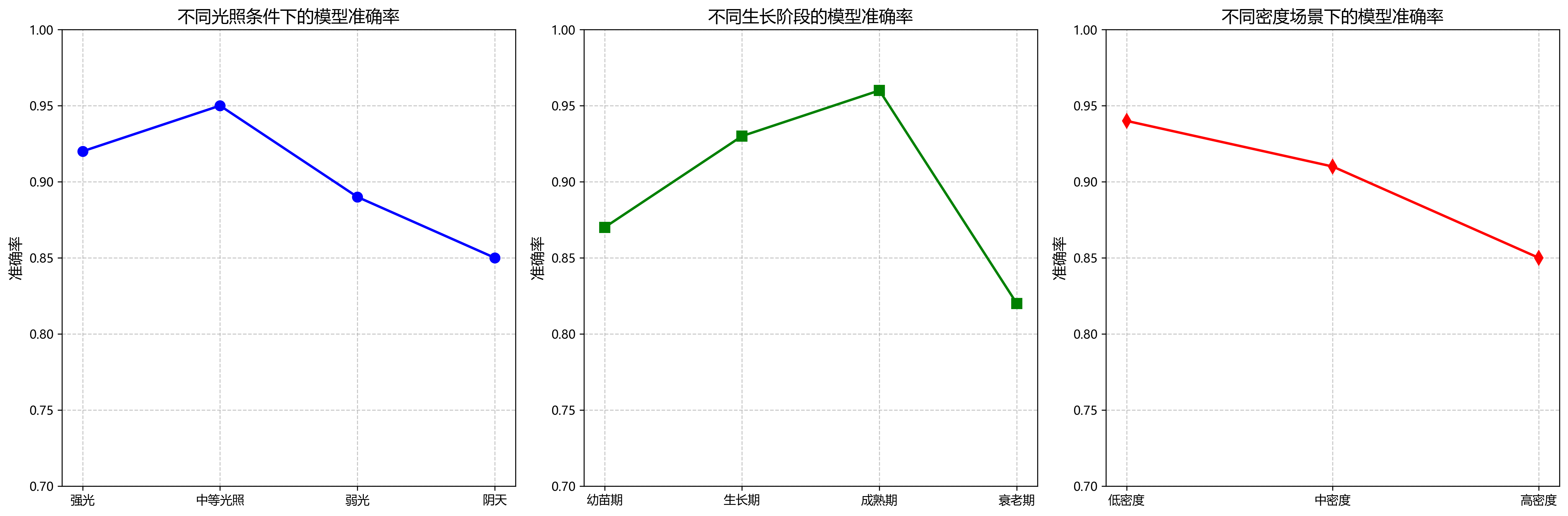 为了评估模型在不同环境下的泛化能力,我们在不同光照条件、不同生长阶段和不同密度场景下对模型进行了测试。🌦️