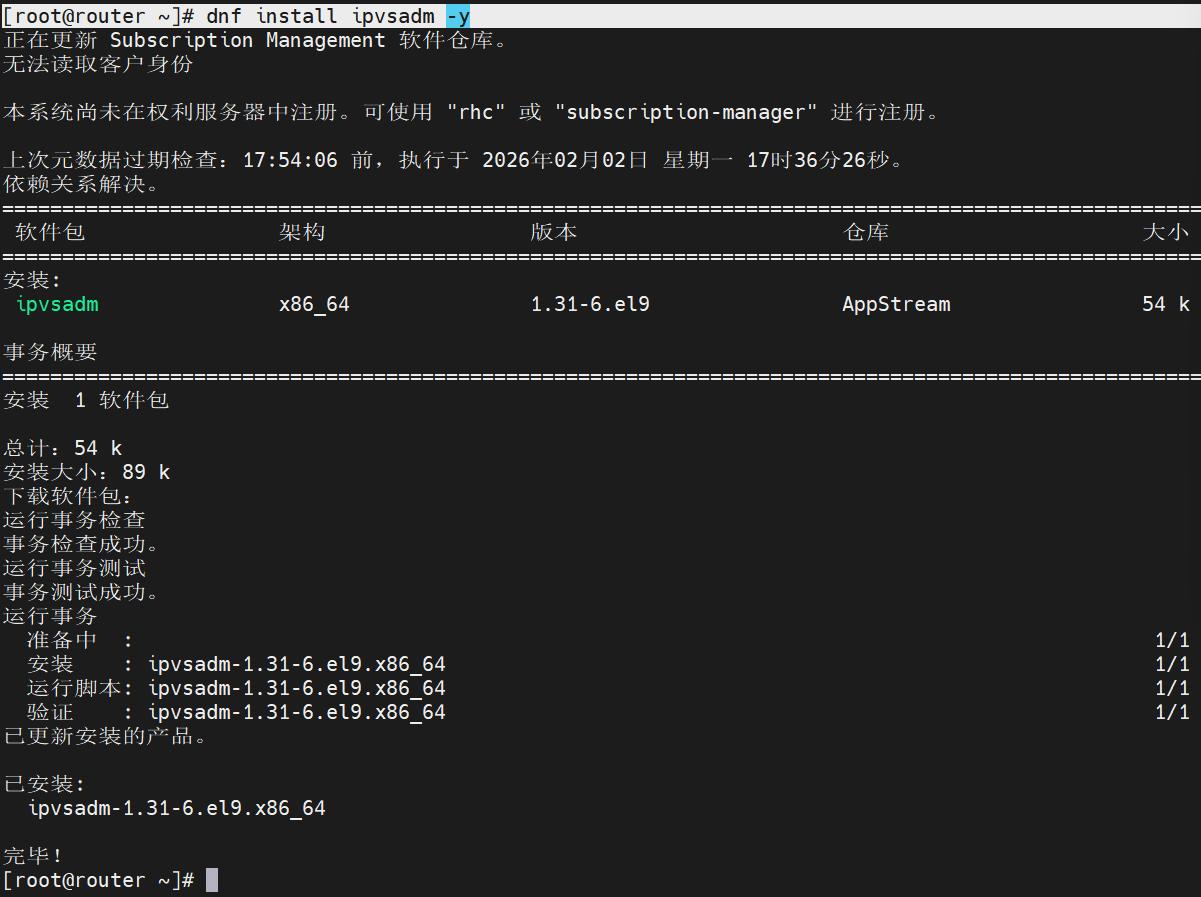 #通过 dnf 包管理器自动安装 ipvsadm 工具(LVS 集群的配置 / 管理命令行工具),-y 表示安装过程中所有确认提示自动回答 "是",无需手动交互