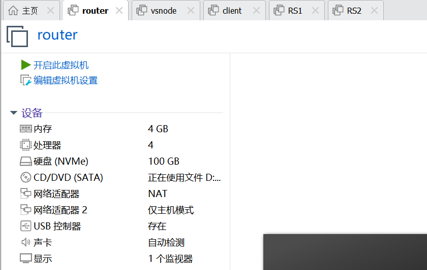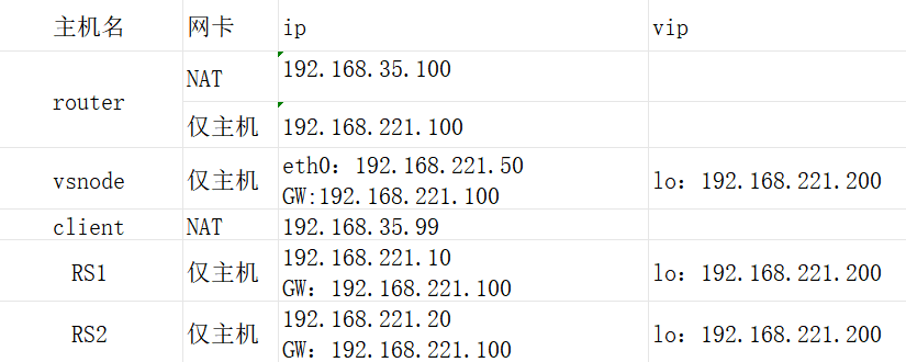 - vsnode 服务器采用双网卡:一个仅主机网卡连接路由节点,另一个仅主机网卡与后端 RS 服务器相连,分别承载 VIP 和 DIP 网络。