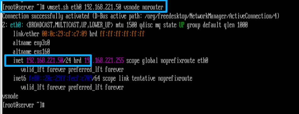 [root@vsnode ~]# vmset.sh eth0 192.168.221.50 vsnode norouter