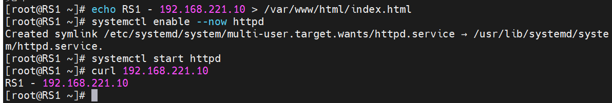 [root@RS1 ~]# echo RS1 - 192.168.221.10 > /var/www/html/index.html