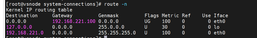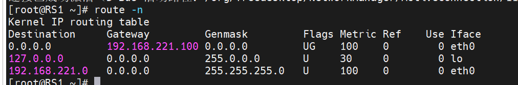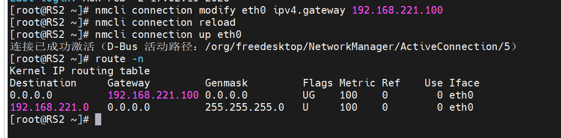 [root@RS2 ~]# nmcli connection modify eth0 ipv4.gateway 192.168.221.100