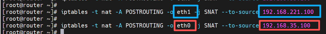 [root@router ~]# iptables -t nat -A POSTROUTING -o eth1 -j SNAT --to-source 192.168.221.100
