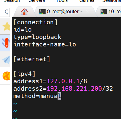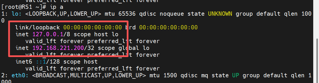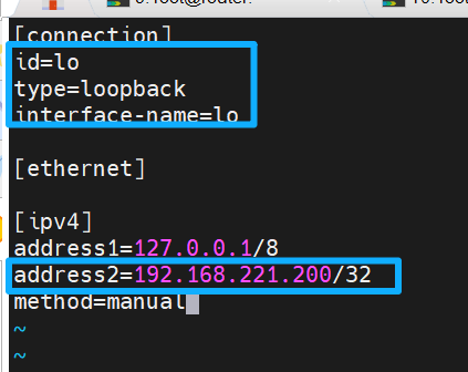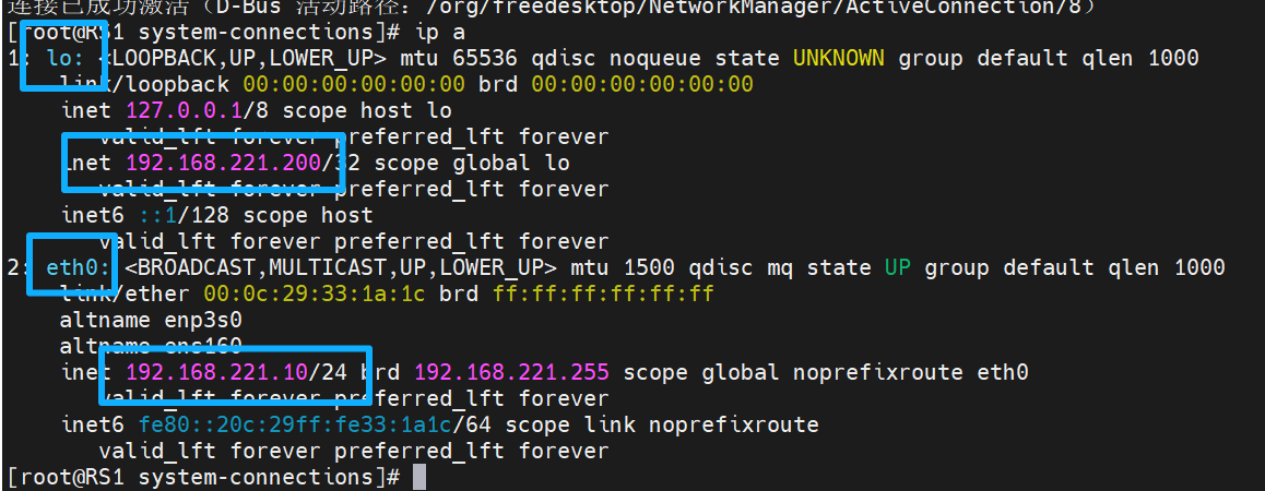 查看 lo 接口地址(能看到 192.168.221.200/32 即成功) ip a show lo # 查看 NetworkManager 配置是否正确 nmcli connection show lo | grep ipv4.addresses