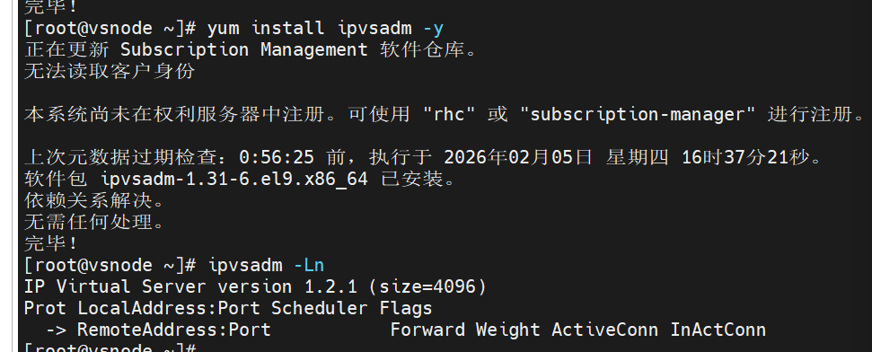 三台虚拟机中,vsnode是调度器,RS1和RS2是服从调度的,因此需要向调度器里面要安装管理LVS的工具(即ipvsadm)