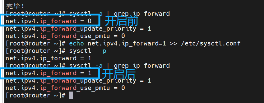 [root@router ~]# sysctl -a | grep ip_forward #查看当前内核路由功能是否开启(=0为没有开启,=1为已开启)