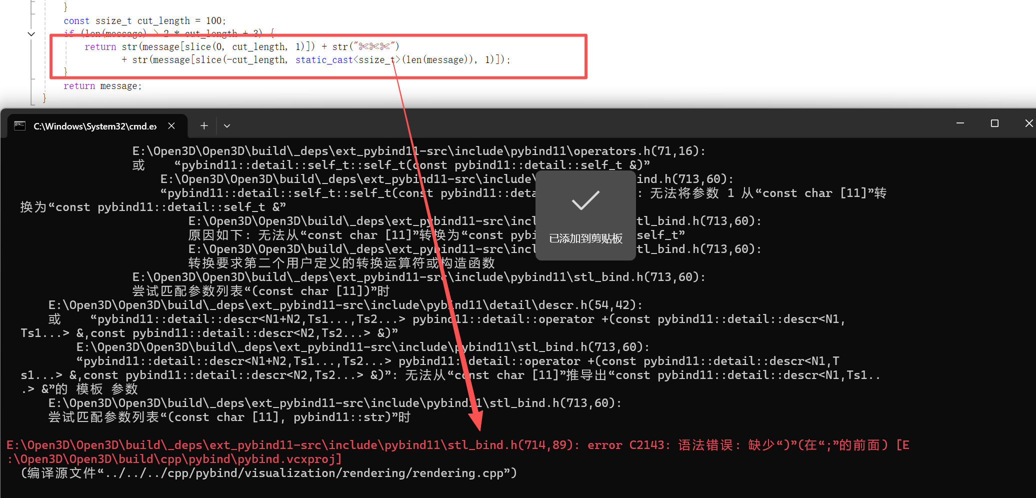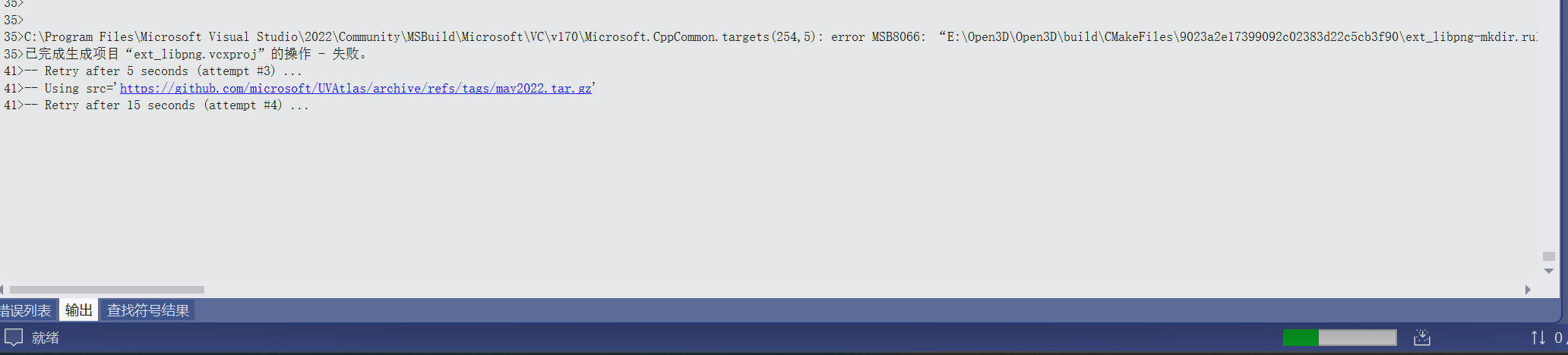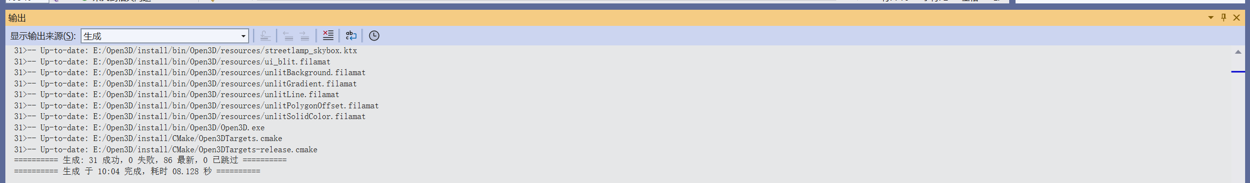 等待编译完成:Open3D 源码较大,编译约10-30分钟(取决于电脑配置),输出窗口无红色报错、提示「生成成功」 即表示编译完成。