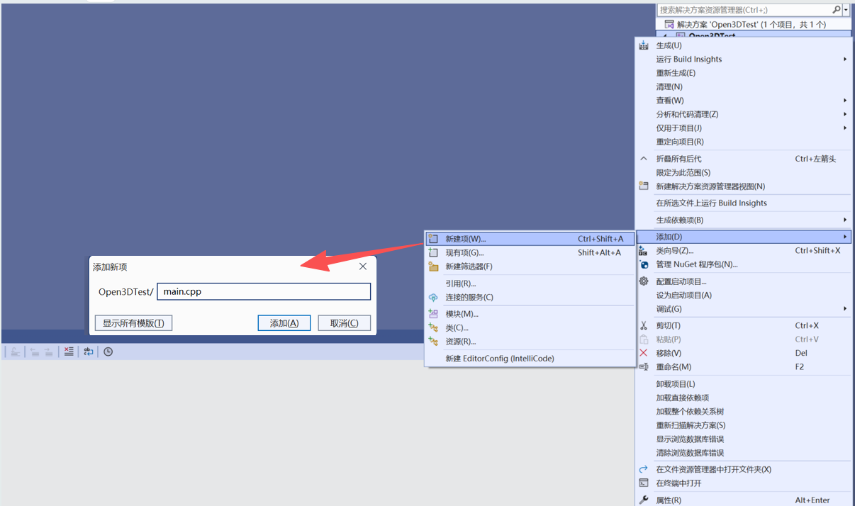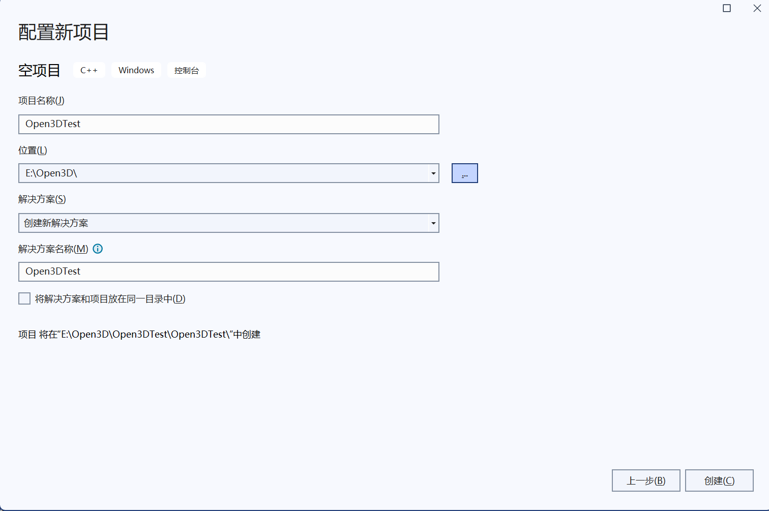 - VS2022 → 创建新项目 → 选择 空项目 → 项目命(如 Open3DTest)→ 选择位置(如 E:\Open3D) → 创建;
