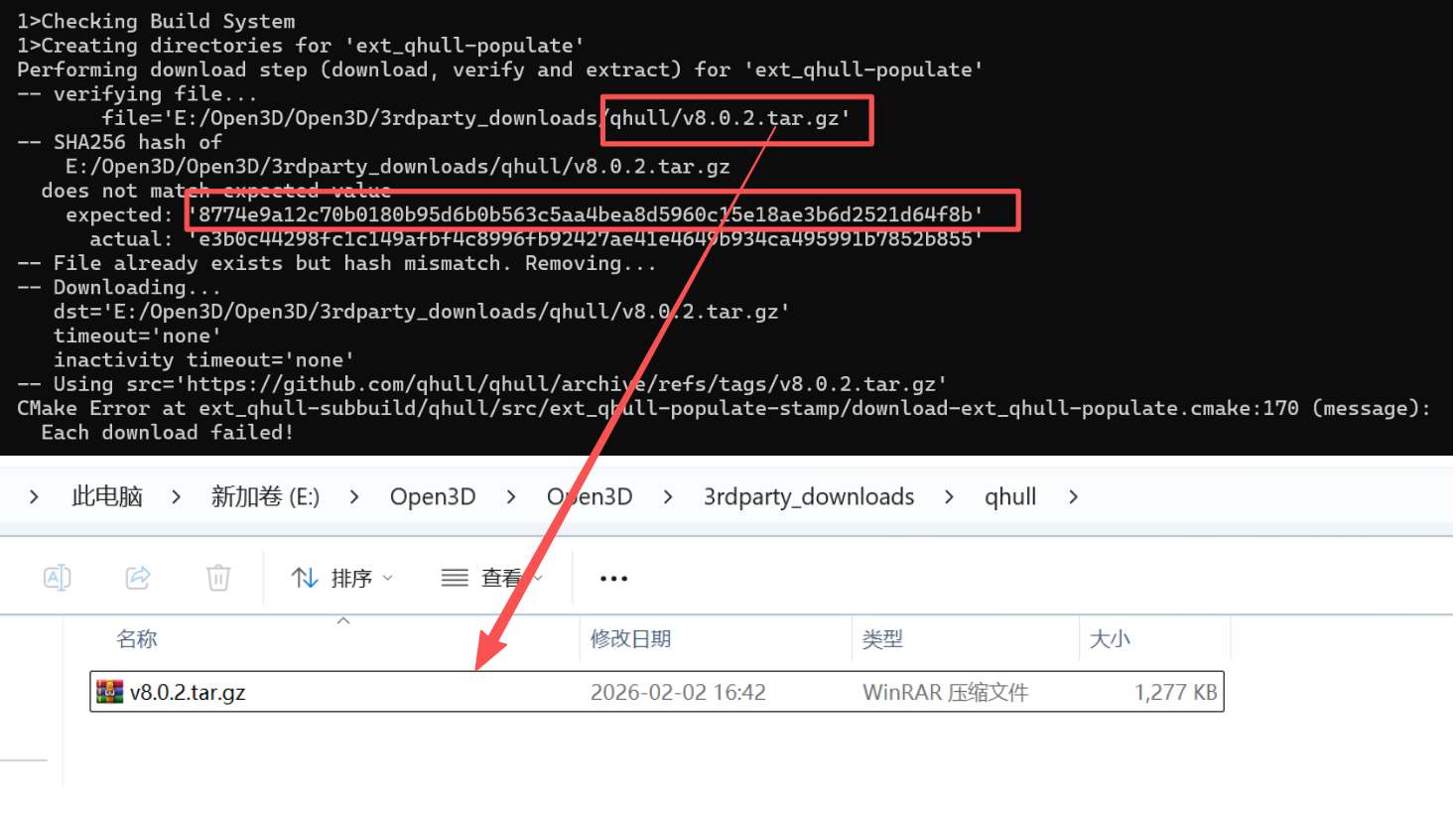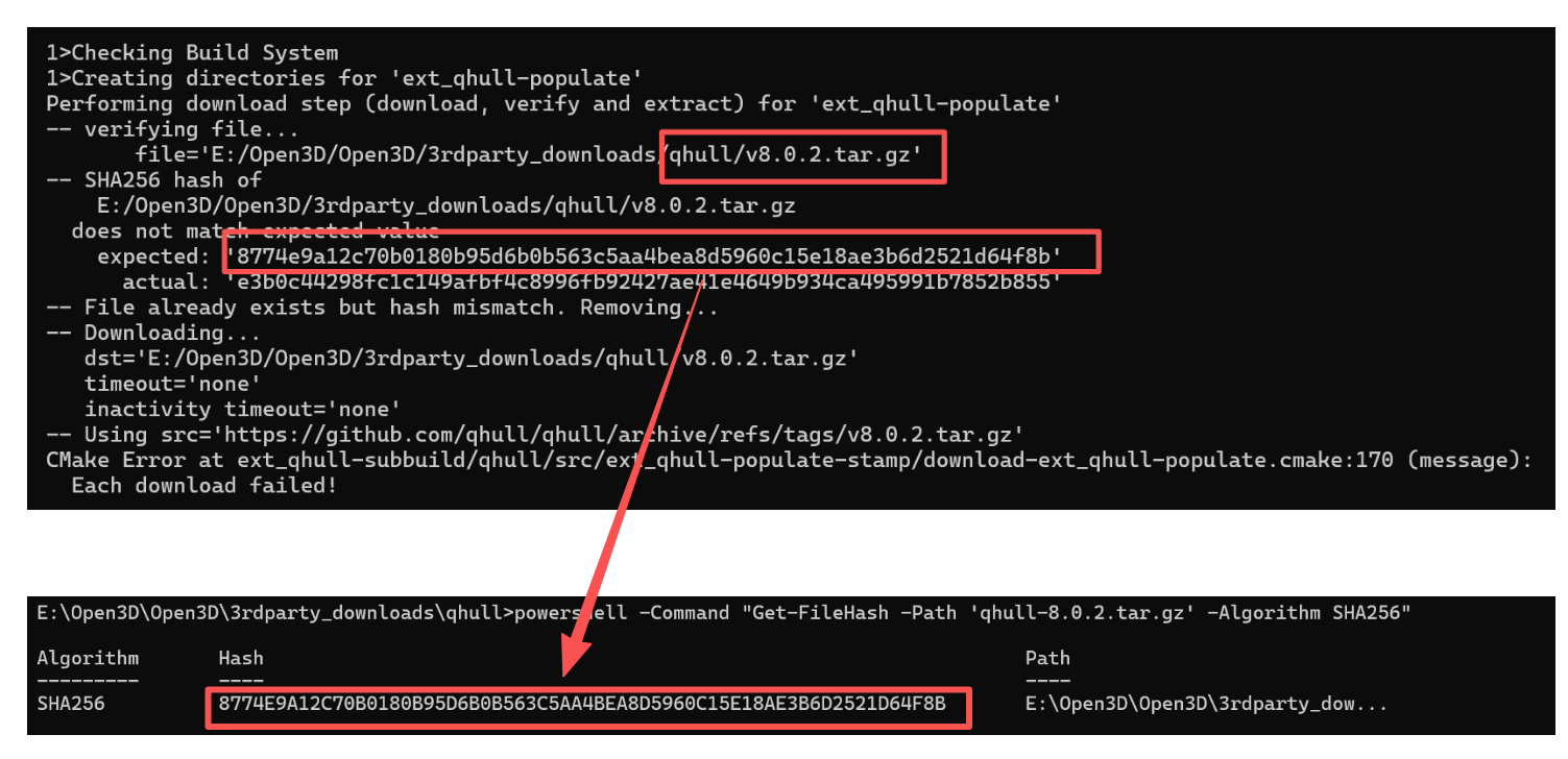 从错误日志中提取3个关键信息:依赖库名 (如qhull)、版本号 (如v8.0.2)、标准SHA256值 ;