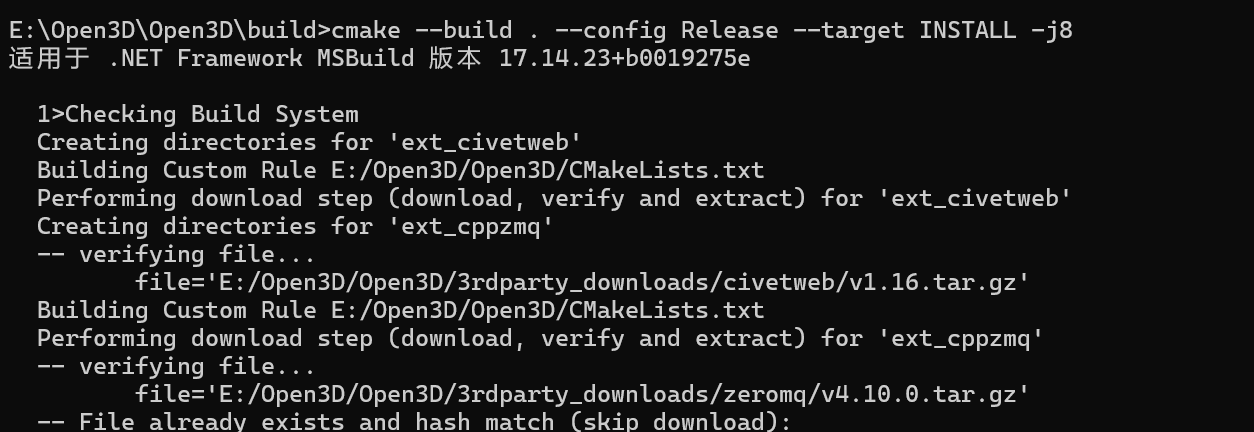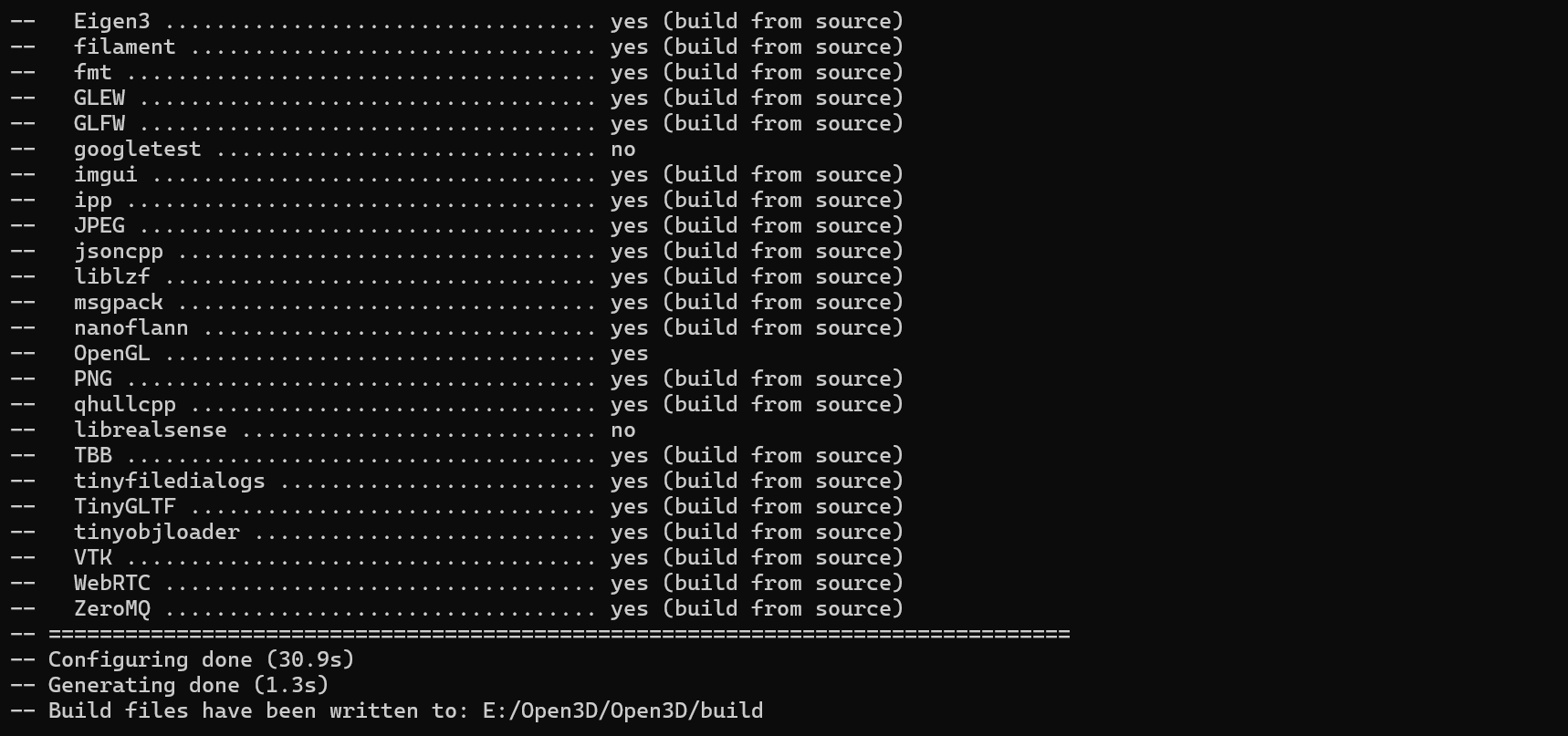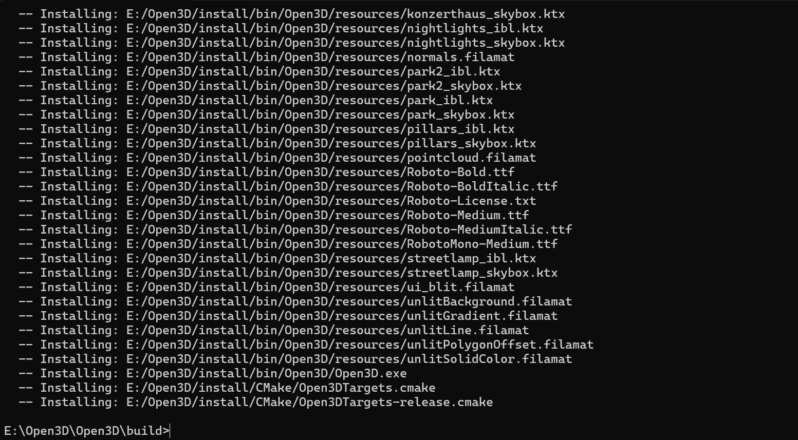 cmake .. -G "Visual Studio 17 2022" -A x64 -DCMAKE_INSTALL_PREFIX=E:\Open3D\install