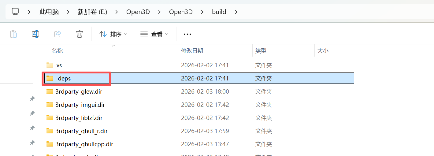 build目录(如E:\Open3D\Open3D\build\)删除 _deps 文件夹(CMake的依赖构建临时缓存,删除后会重新生成,无任何影响)。