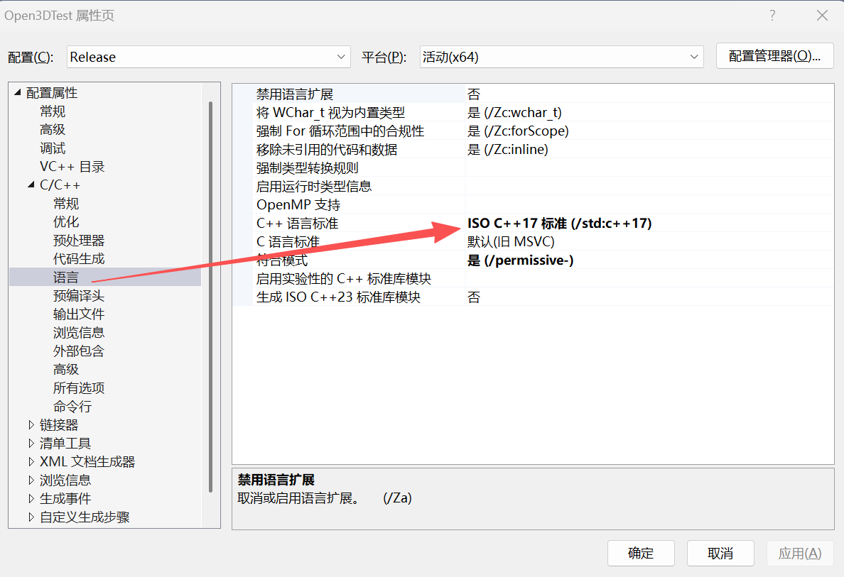 - 右键项目「Open3DTest」→「属性」→「C/C++」→「语言」;