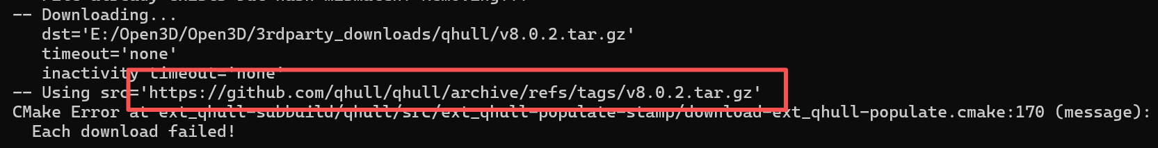 核心问题仍是国内网络访问 GitHub/Codeload 的 HTTPS 资源不稳定,同样的Open3D 的所有第三方依赖均有固定下载地址和缓存目录,直接手动下载符合版本的压缩包放入指定目录,CMake 会自动跳过下载、直接验证并使用,无需修改任何配置。