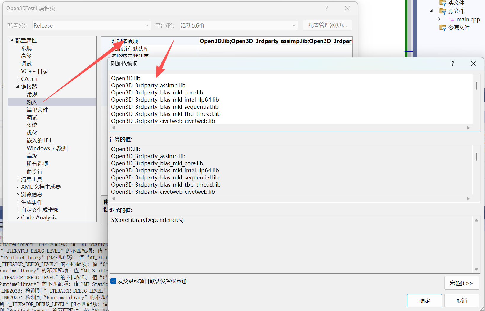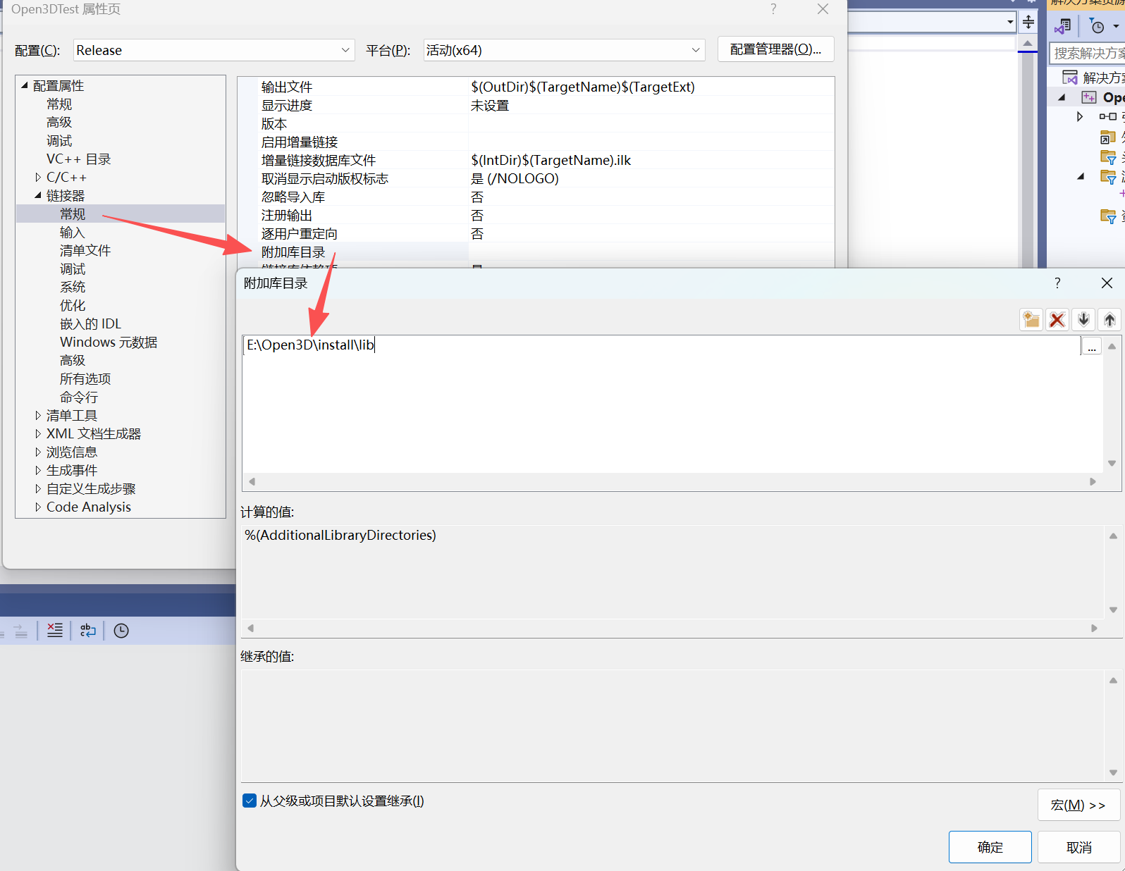 添加 Open3D 核心库文件(Release 版本,Debug 版本库名后加