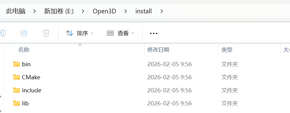 编译完成后,进入第四步指定的安装路径(如 E:\Open3D\install),会自动生成 4 个核心文件夹,结构如下: