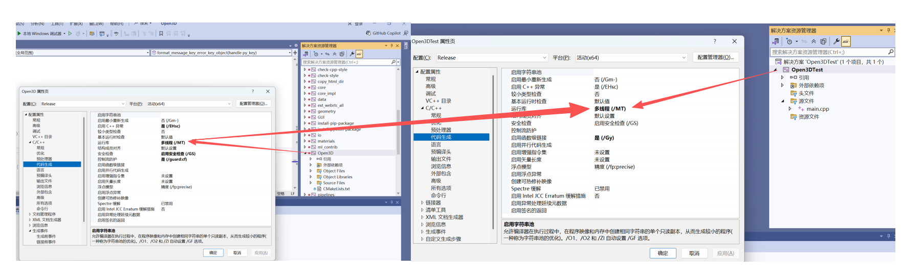 - 右键项目「Open3DTest」→「属性」→「C/C++」→「代码生成」;