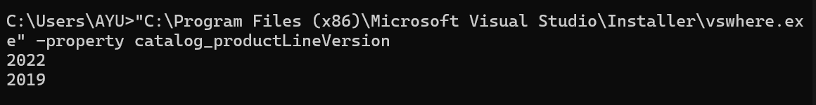 bash"C:\Program Files (x86)\Microsoft Visual Studio\Installer\vswhere.exe" -property catalog_productLineVersion