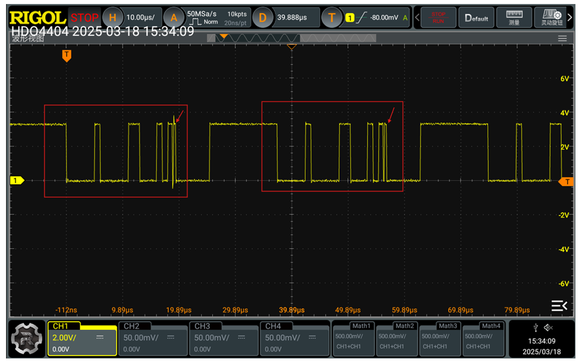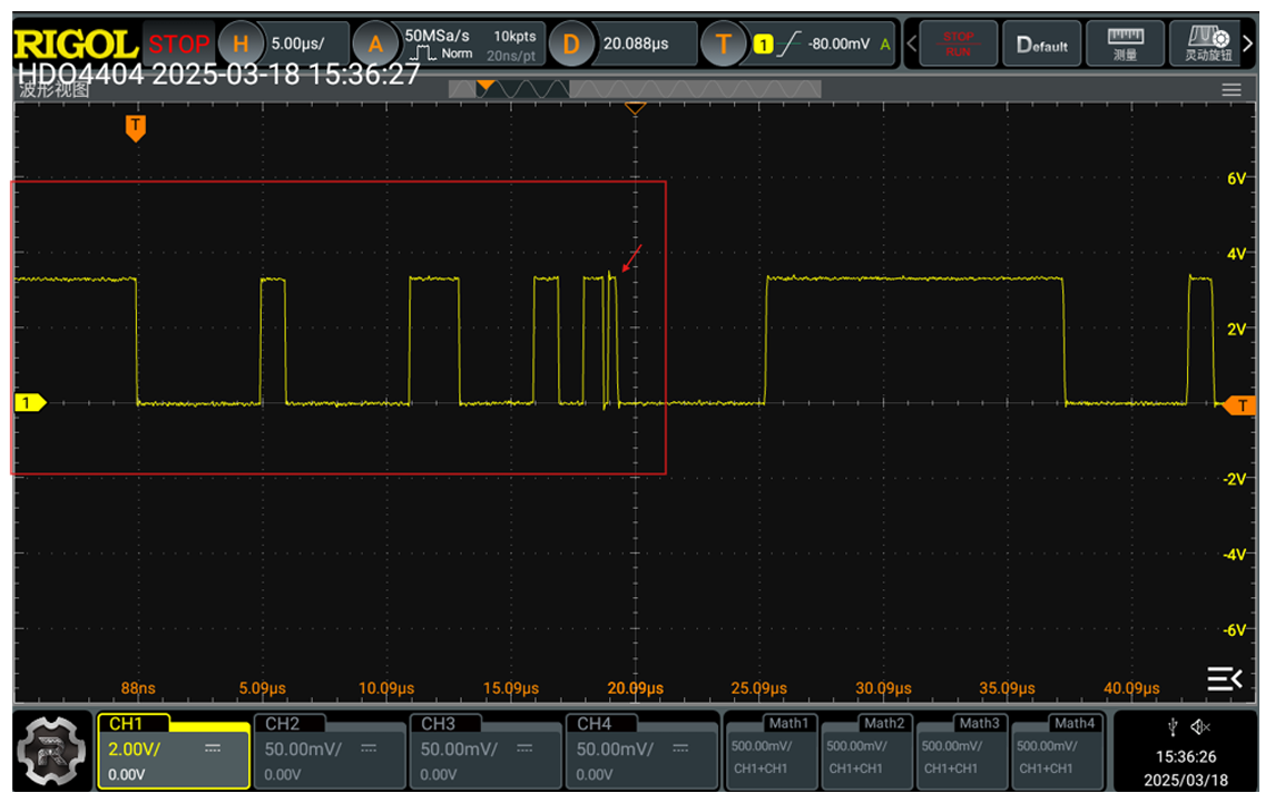 把上图红色箭头部分的波形继续放大,可以看到下面的波形,图中红色箭头指向的为