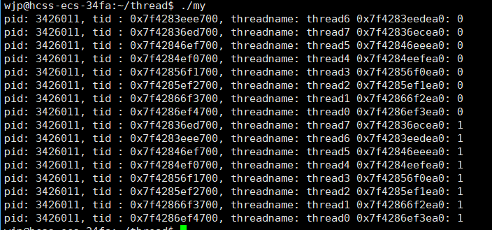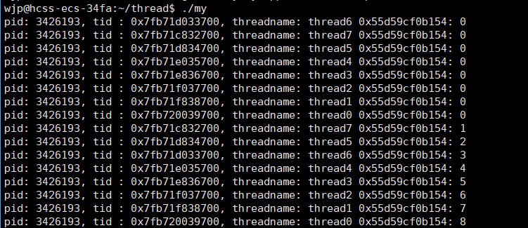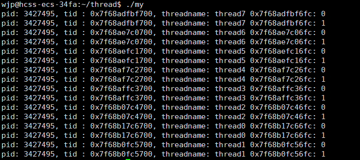 cout<<"pid: "<<getpid()<<", tid : "<<Tohex(pthread_self())<<", threadname: "<<td->threadname<<" "<<&test_i<<": "<<test_i<<endl;