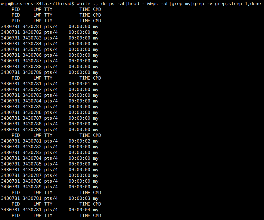 while :; do ps -aL|head -1&&ps -aL|grep my|grep -v grep;sleep 1;done
