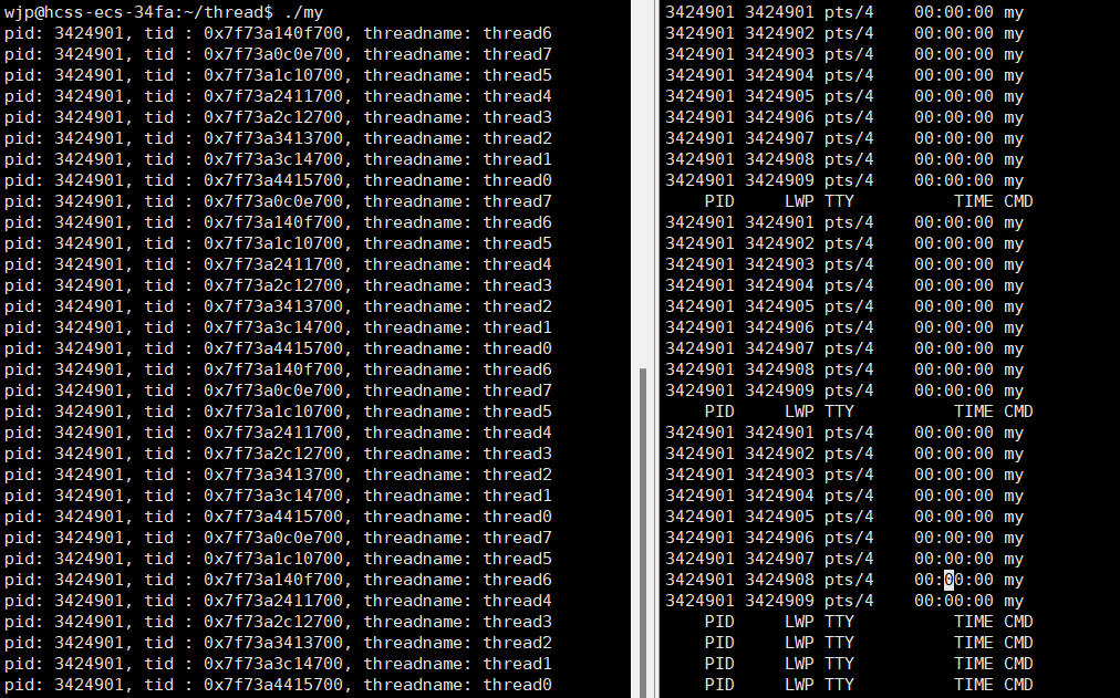 从左侧代码的运行结果可以看出来这些线程的pid都是一样的,说明都是一个进程创建出来的,右侧可以看出来pid一样但是LWP不一样,说明确实瞬间创建出来了多个线程。